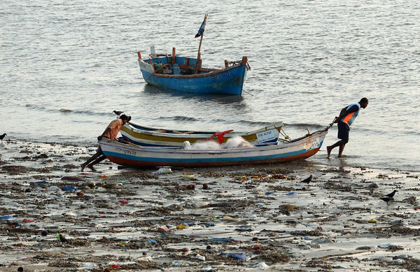 Indian fishermen pushed their boat through plastic waste last month in Mumbai. Credit Punit Paranjpe/Agence France-Presse — Getty Images